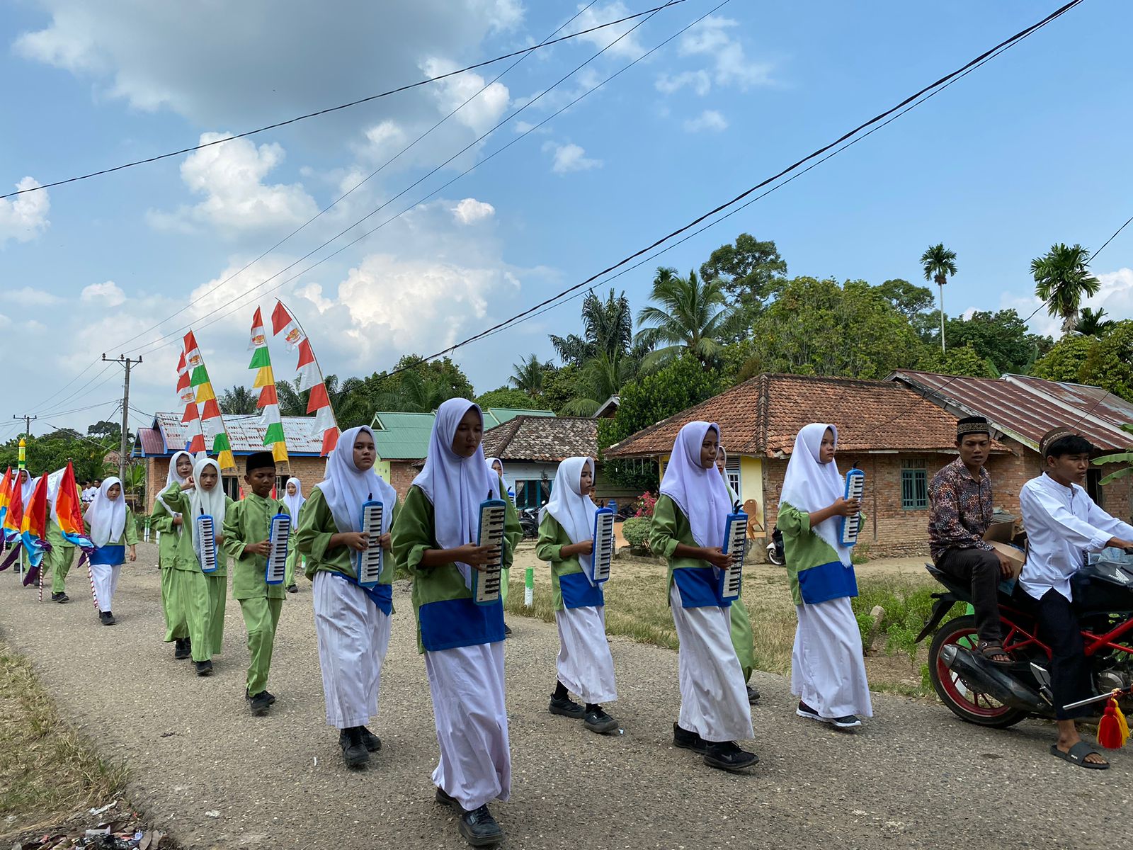 Lubuk Ruso - Drum band MTsN 5 Batang Hari memeriahkan pawai ta`aruf pembukaan Musabaqah Tilawatil Qur’an (MTQ) ke-7 tingkat Desa Senaning Tahun 2024, Jum’at (19/07/2024).