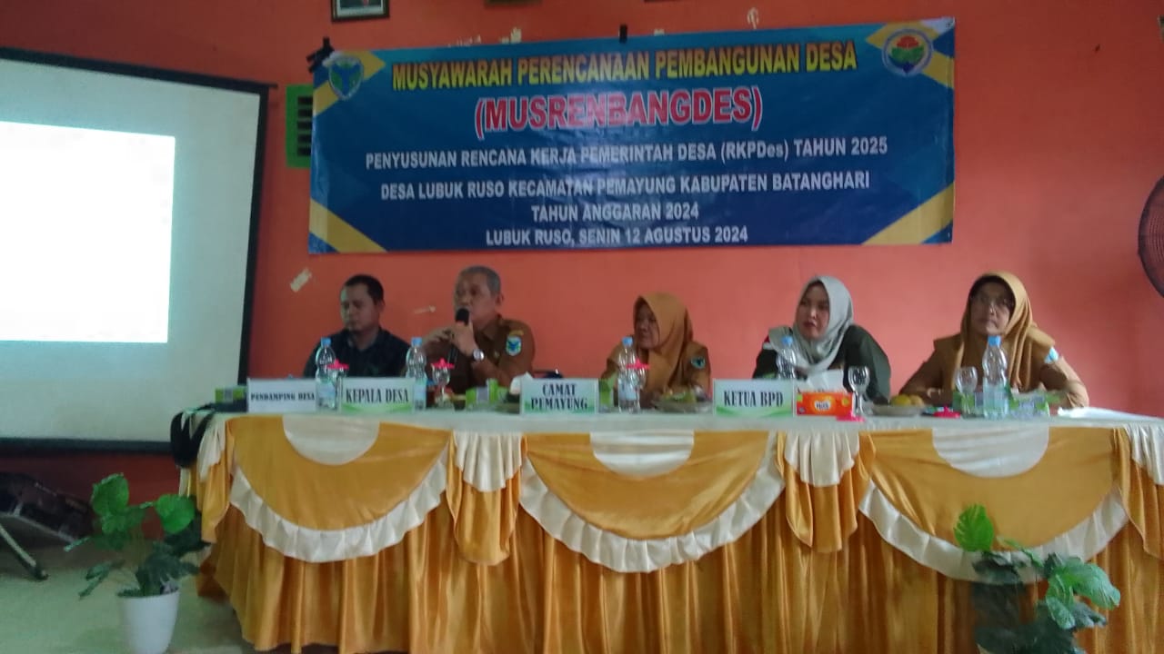 Bertempat di aula kantor desa Lubuk Ruso, musrembang tersebut akan membahas rancangan RKPDes Tahun Anggaran 2024 dan DU-RKP Tahun 2025 Desa Lubuk Ruso. Kegiatan tersebut dihadiri oleh seluruh perangkat desa Lubuk Ruso dan beberapa tamu seperti Ketua BPD, Lembaga Adat desa Lubuk Ruso dan seluruh stakeholder Pemerintah Desa. Senin (12/08/2024).