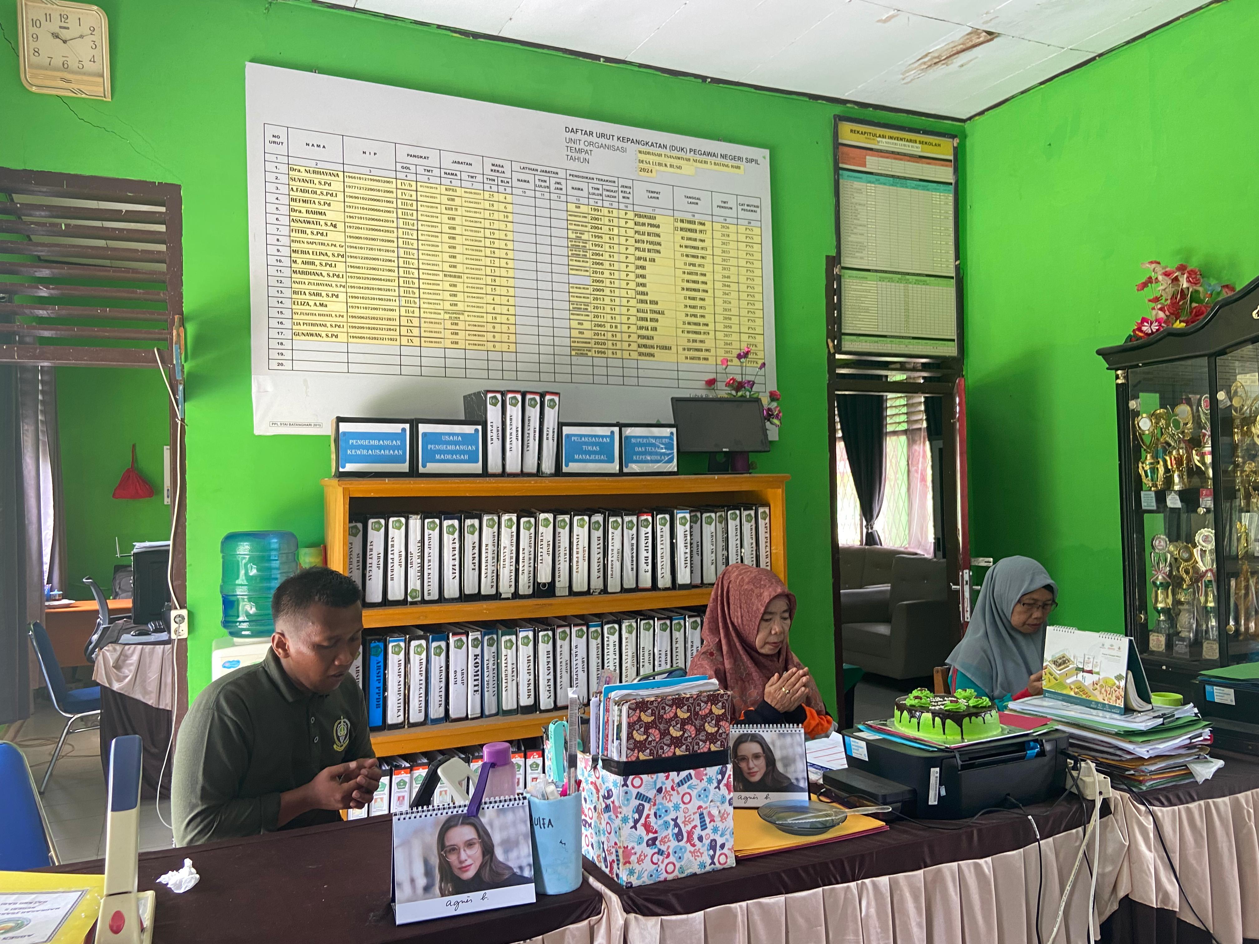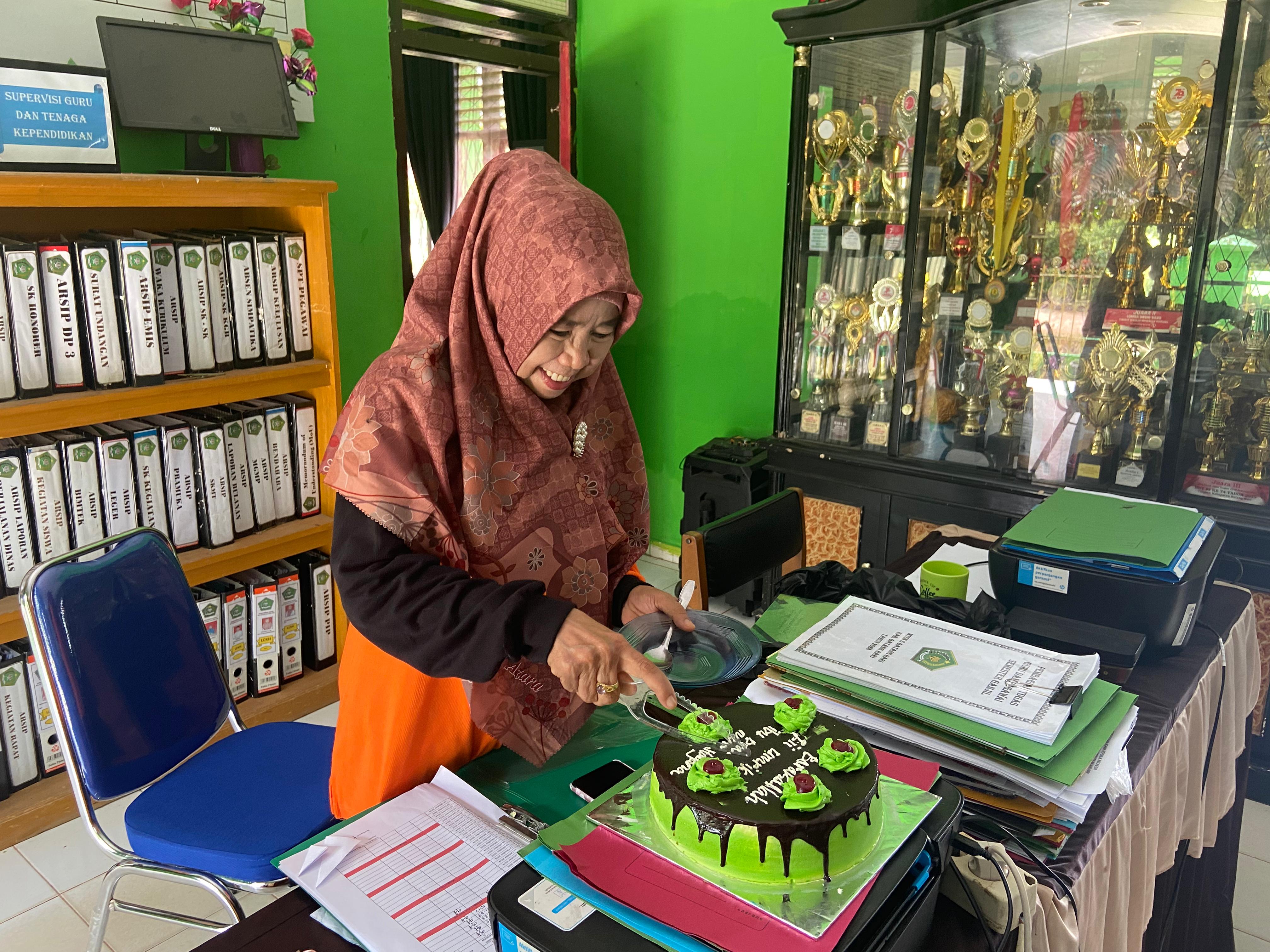 Lubuk Ruso (MTsN 5 Batang Hari) --- Pada jam istirahat, seluruh majelis dan staf TU memberikan kejutan kecil kepada ibu kepala madrasah yang sedang berulang tahun. (12/10)