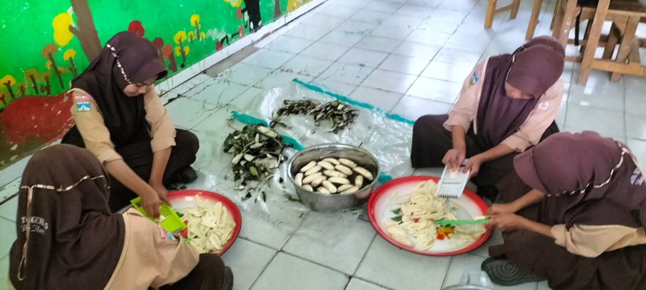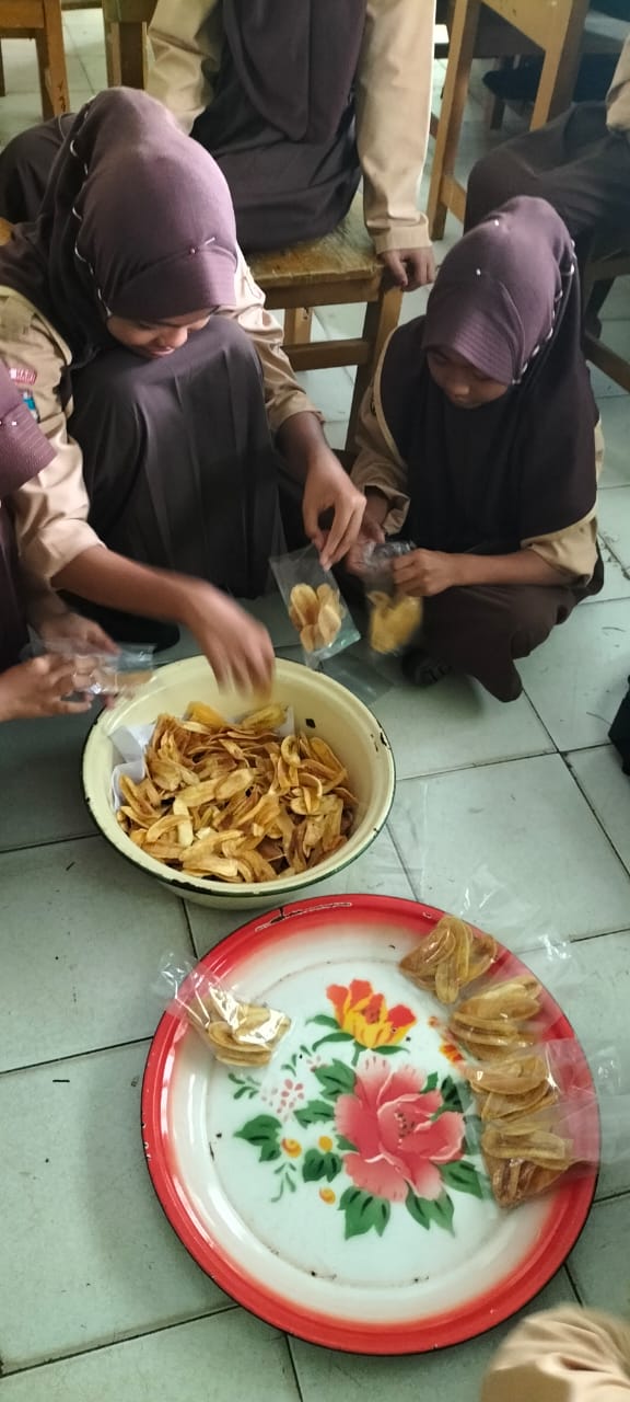 Lubuk Ruso (MTsN 5 Batang Hari) --- Siswa Kelas VIIIA MTsN 5 Batang Hari membuat makanan ringan yaitu keripik pisang dalam Proyek Penguatan Profil Pelajar Pancasila (P5) Fase D dengan tema kewirausahaan.