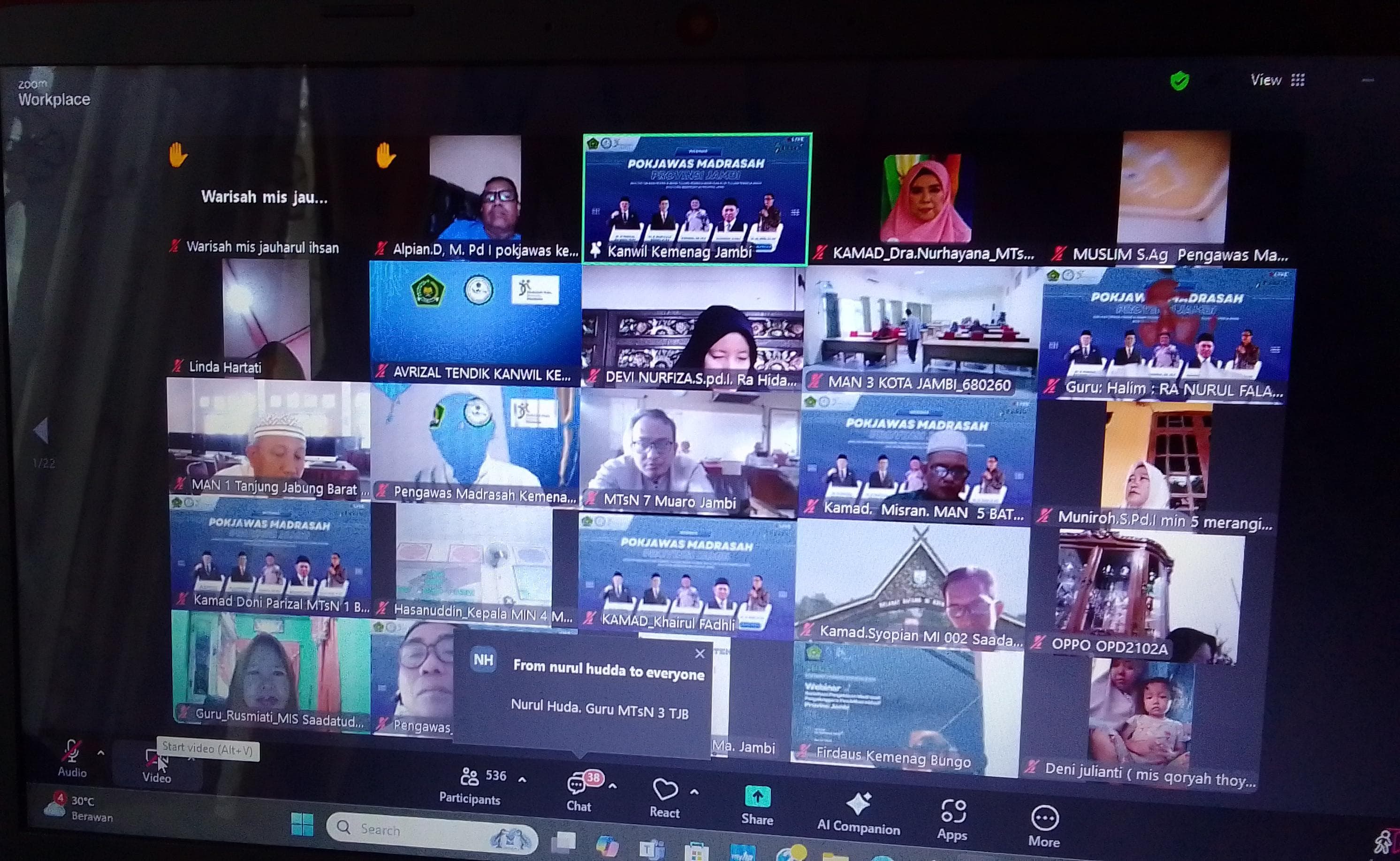 Lubuk Ruso (MTsN 5 Batang Hari) --- Pokjawas Madrasah se-Provinsi Jambi bersinergi dengan Kanwil Provinsi Jambi mengadakan Webinar Analisis Capaian Pembelajaran, Tujuan Pembelajaran dan Alur Tujuan Pembelajaran Bagi Guru Madrasah Se-Propinsi Jambi pada hari ini, Jumat (14/02/2025).
