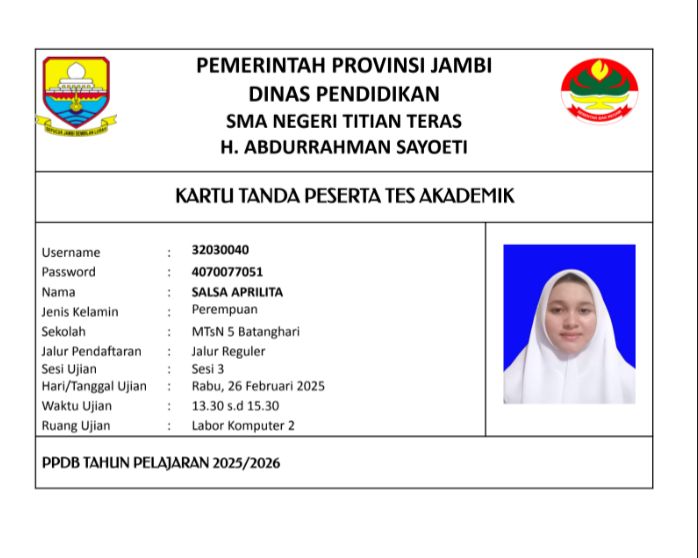 Lubuk Ruso (MTsN 5 Batang Hari) --- Setelah mengikuti beberapa tahapan seleksi untuk menjadi siswi di SMAN Titian Teras H. Abdurahman Sayoeti Provinsi Jambi, Salsa Aprilita dinyatakan LULUS. Kamis (27/02/2025).