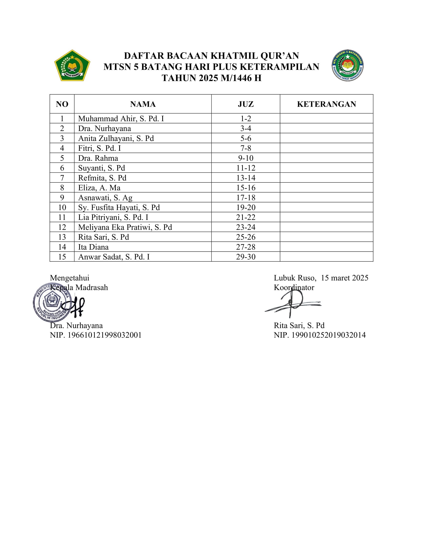 Lubuk Ruso (MTsN 5 Batang Hari) --- Dalam rangka memperingati Nuzulul Quran dan mendukung program Indonesia Khataman Al-Quran yang diinisiasi oleh Kementerian Agama Republik Indonesia, seluruh warga MTsN 5 Batang Hari dengan penuh semangat berpartisipasi dalam kegiatan ini (17/03/2025). Untuk memastikan koordinasi yang optimal, MTsN 5 Batang Hari membuat 2 akun guna memantau dan mengatur jalannya khataman Al-Quran secara kolektif. 1 akun untuk pendidik dan tenaga kependidikan dan 1 akun lagi untuk peserta didik MTsN 5 Batang Hari.