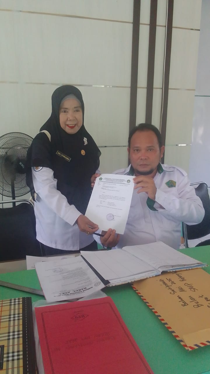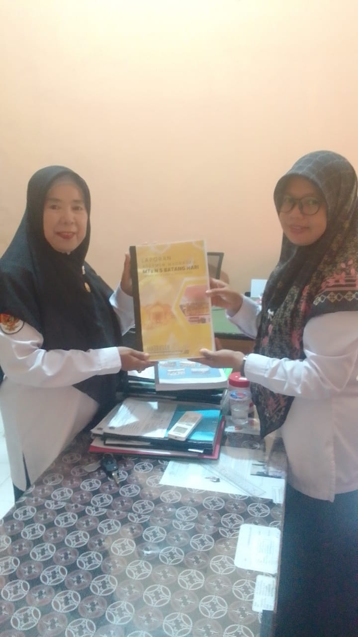 Lubuk Ruso (MTsN 5 Batanghari) --- Kepala MTsN 5 Batanghari, Dra. Nurhayana menyerahkan Laporan Asesmen Madrasah (AM) dan PPDBM Tahun Ajaran 2025/2026 kepada Kasi Penmad Kemenag Kabupaten Batanghari pada hari Senin, 19 Mei 2025. Penyerahan laporan ini menandai akhir dari proses Asesmen Madrasah (AM) dan PPDBM Tahun Ajaran 2025/2026 kepada yang telah dilaksanakan dengan lancar dan sukses.