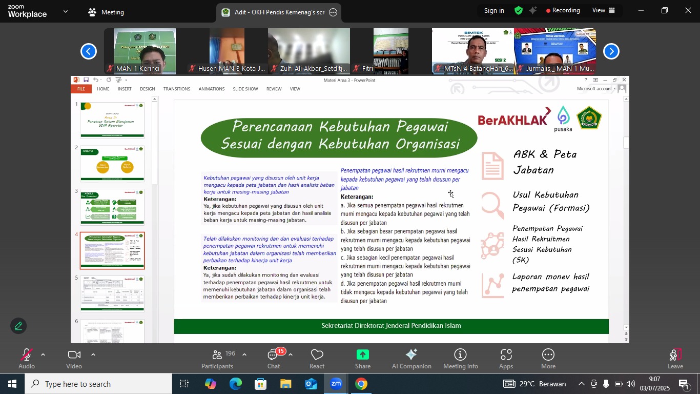Kepala Madrasah, Dra. Nurhayana beserta Tim PMPZI MTsN 5 Batang Hari, turut hadir pada kegiatan Zoom Meeting Bimtek Pengisian Lembar Kerja PMPZI yang diikuti dengan penuh antusias pada hari Kamis (03/07/25) pukul 08.00 wib sd selesai.