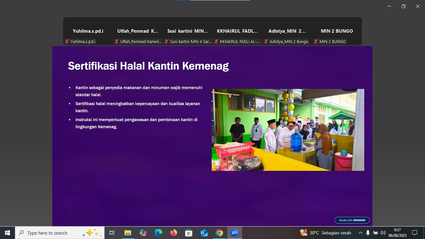 Batang Hari, 6 Agustus 2025 — Dalam upaya mendukung program nasional tentang jaminan produk halal, MTsN 5 Batang Hari mengikuti kegiatan Sosialisasi Sertifikasi Halal pada Kantin Madrasah yang diselenggarakan oleh Kantor Wilayah Kementerian Agama Provinsi Jambi, Rabu pagi (6/8/2025) secara virtual melalui platform Zoom Meeting.