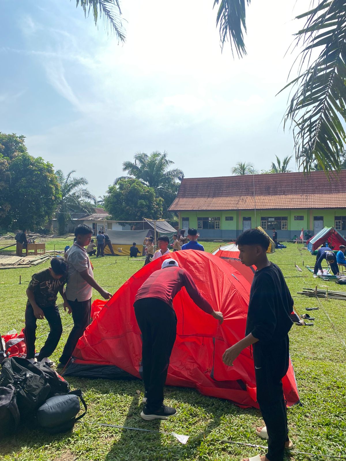 Setiap regu menunjukkan kerja sama yang solid, mulai dari menggelar alas tenda, memasang tiang, hingga mengikat tali pancang. Meski terik matahari cukup menyengat, hal itu tidak mengurangi semangat mereka.