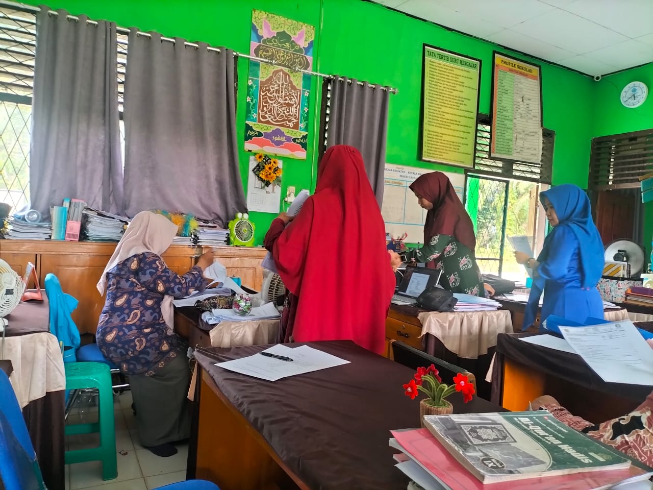 Lubuk Ruso (MTsN 5 Batang Hari) --- Seluruh personil MTsN 5 Batang Hari terlihat kompak dalam melaksanakan kegiatan kelengkapan administrasi di ruang guru. Kegiatan ini berlangsung dengan tertib dan penuh semangat, ditandai dengan para guru dan staf TU yang saling membantu memeriksa serta menyusun berbagai dokumen penting madrasah.