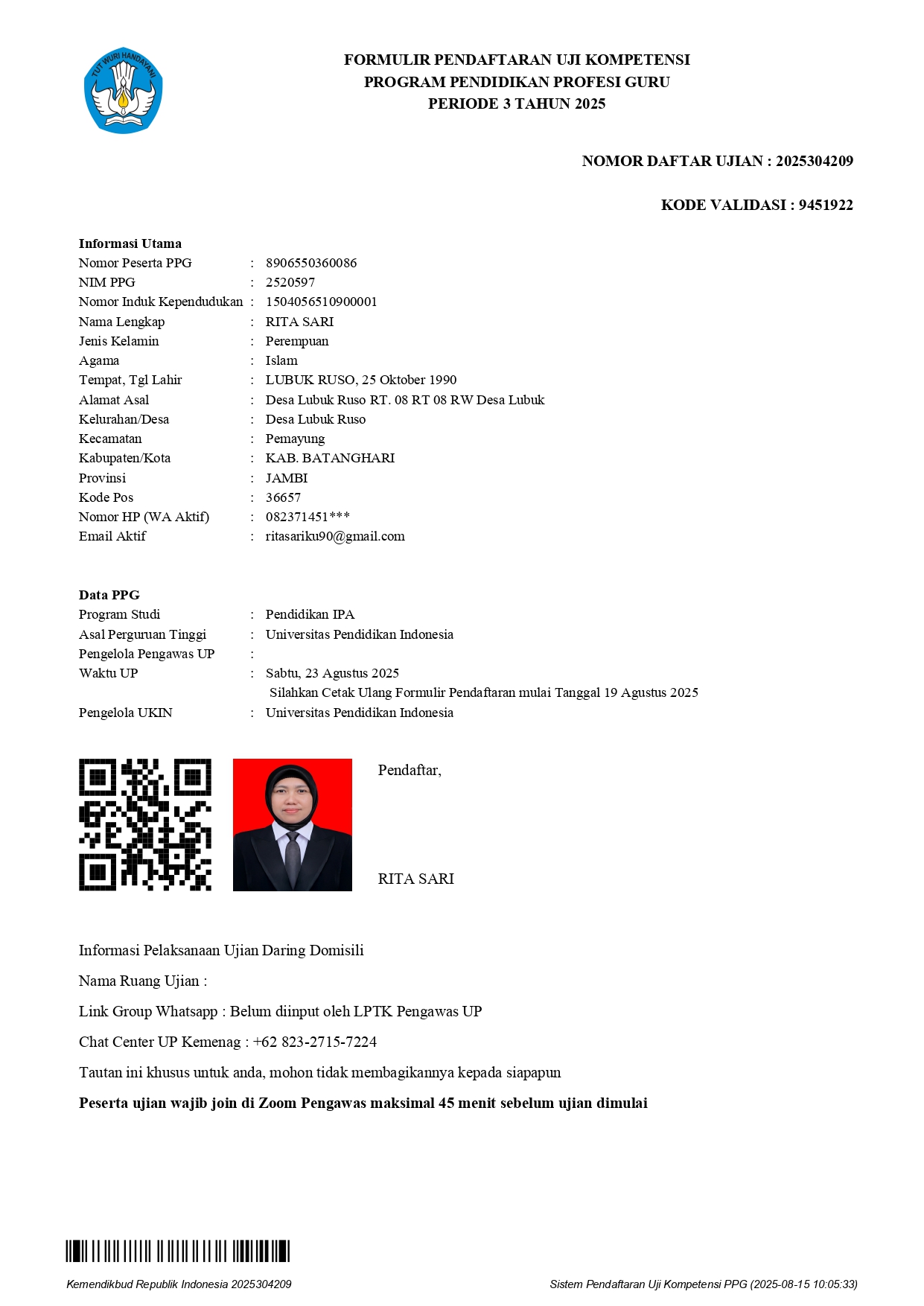 Lubuk Ruso (MTsN 5 Batang Hari) --- Tiga guru mapel umum MTsN 5 Batang Hari, Sy. Fuspita Hayati, S. Pd, Rita Sari, S. Pd, dan Anita Zulhayani, S. Pd, telah resmi mendaftar sebagai peserta Uji Kompetensi Program Pendidikan Profesi Guru (UKPPG) Periode 3 Tahun 2025. Hal ini dibuktikan dengan diterbitkannya Formulir Pendaftaran Uji Kompetensi yang dikeluarkan oleh Kementerian Pendidikan, Kebudayaan, Riset, dan Teknologi. Jumat (15/8/25)