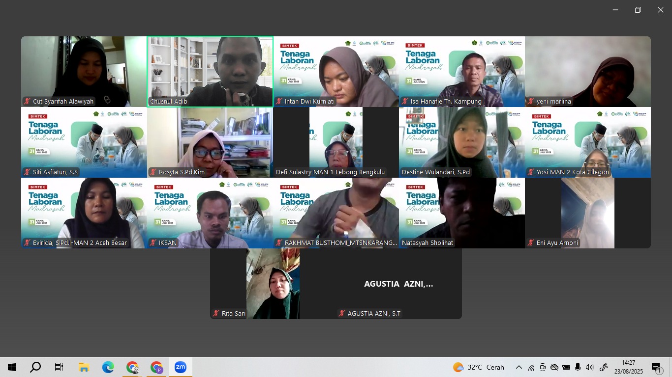 Batang Hari – Salah satu guru MTsN 5 Batang Hari, Rita Sari, S.Pd, yang merupakan guru mata pelajaran IPA, mengikuti kegiatan Bimbingan Teknis (Bimtek) Tenaga Laboran Madrasah secara daring melalui aplikasi Zoom, pada Kamis, 21 Agustus 2025.