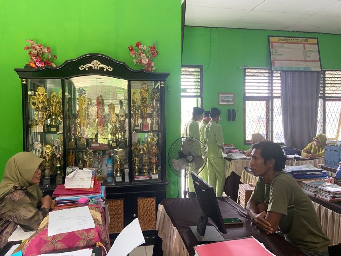 Batang Hari – Staf Tata Usaha (TU) MTsN 5 Batang Hari memberikan pengarahan kepada warga yang datang untuk mengurus proses pemindahan anaknya menjadi peserta didik di madrasah tersebut, Jumat (19/9/2025).