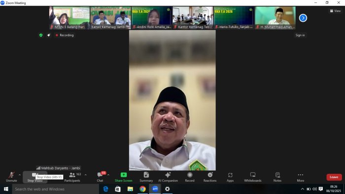 Pemayung (MTsN 5 Batang Hari)------------MTsN 5 Batang Hari berpartisipasi dalam Rapat Koordinasi Penyusunan Rencana Kerja dan Anggaran Tahun Anggaran 2026 yang diselenggarakan oleh Kantor Wilayah Kementerian Agama Provinsi Jambi pada Senin, 6 Oktober 2025. Kegiatan ini dilaksanakan secara virtual melalui Zoom Meeting sesuai dengan undangan resmi Kanwil Kemenag Jambi