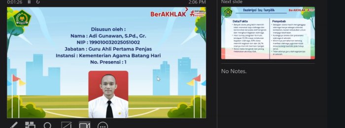 Batang Hari, 14 Oktober 2025 — Kepala MTsN 5 Batang Hari mengikuti kegiatan seminar akhir laporan aktualisasi yang disampaikan oleh Adi Gunawan, S.Pd., Gr., guru CPNS mata pelajaran Pendidikan Jasmani, Olahraga, dan Kesehatan (PJOK), secara daring melalui aplikasi Zoom Meeting, pada Senin (14/10).