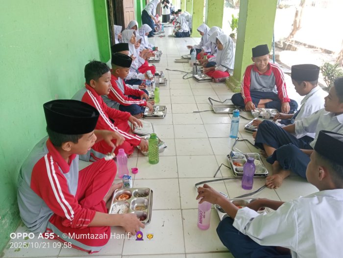 Dengan menggunakan ompreng yang telah dibagikan sebelumnya, para siswa duduk berjejer rapi menikmati santapan siang bersama di teras madrasah. Mereka tampak antusias dan tertib selama kegiatan berlangsung. Guru dan wali kelas turut mendampingi untuk memastikan kegiatan berjalan lancar dan sesuai dengan tata tertib MBG.
