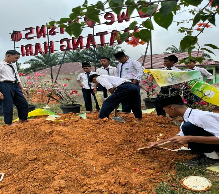 Batang Hari --- Semangat gotong royong tampak jelas di lingkungan MTsN 5 Batang Hari ketika sejumlah siswa dengan penuh antusias membantu proses penimbunan taman madrasah pada waktu istirahat, Selasa (4/11/25).