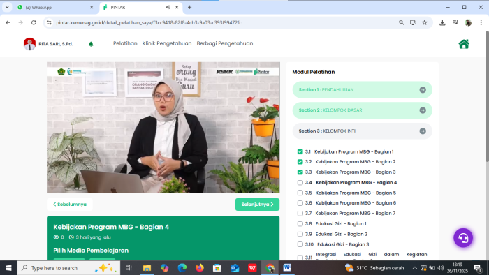 Melalui platform PINTAR, para peserta mengakses materi yang telah dikemas dalam bentuk video, modul pembelajaran, serta penjelasan teknis mengenai pelaksanaan program makanan bergizi gratis di lingkungan madrasah. Materi tersebut mencakup tujuan program, mekanisme penyaluran, peran madrasah, teknis pendataan, serta standar keamanan pangan yang harus diterapkan.