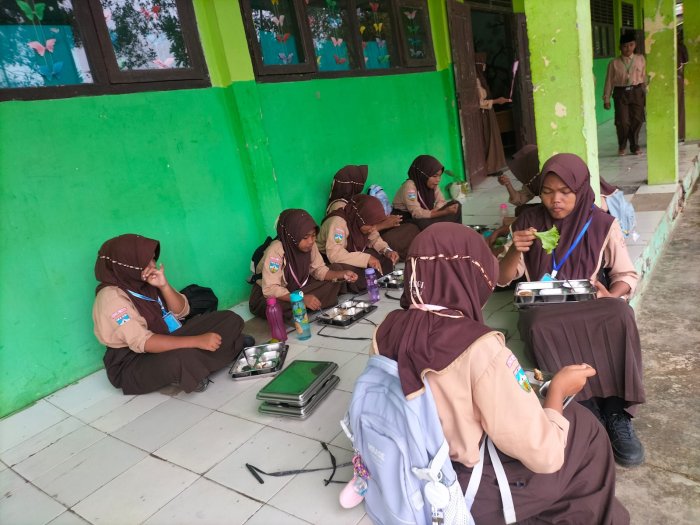 Kegiatan makan MBG ini dilaksanakan pada waktu istirahat di sela-sela ujian, dengan tujuan memberikan energi tambahan kepada peserta agar tetap fokus dan memiliki kondisi fisik yang prima. Para siswa terlihat menikmati makanan yang disediakan sambil beristirahat sejenak dari suasana ujian yang membutuhkan konsentrasi tinggi.