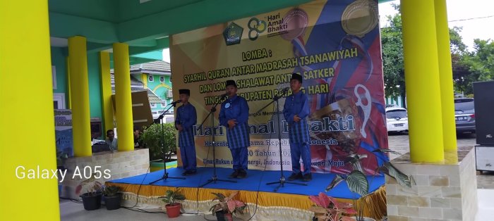Batang Hari — Tim syarhil MTsN 5 Batang Hari yang beranggotakan Muhammad Mustaqim, Rifki Sarhilman, dan Muhammad Wafi Alrizki tampil percaya diri dan memukau pada ajang PORSENI Hari Amal Bakti (HAB) Kementerian Agama Kabupaten Batang Hari ke-80 yang diselenggarakan pada Rabu, 10 Desember 2025.