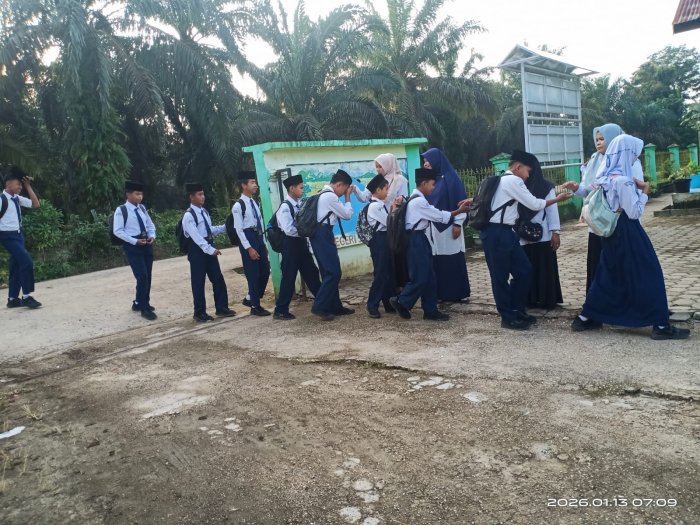 Batang Hari (MTsN 5 Batang Hari) — Suasana pagi di MTsN 5 Batang Hari tseperti biasa penuh kehangatan. Wakil Kepala madrasah bersama para guru dan tenaga kependidikan menyambut kedatangan siswa di gerbang madrasah sebagai bagian dari pembiasaan positif dan penguatan karakter disiplin.