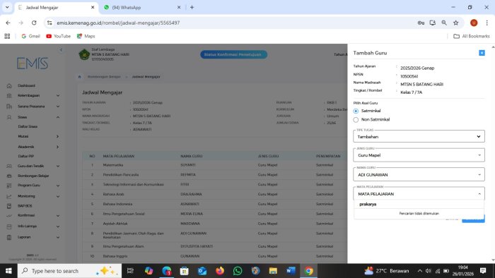 Batang Hari — Operator EMIS MTsN 5 Batang Hari melaksanakan kegiatan input data siswa pindahan serta pengisian jadwal mengajar guru untuk Semester Genap Tahun Pelajaran 2025/2026 pada Kamis (29/1/2026). Kegiatan ini dilakukan melalui aplikasi Education Management Information System (EMIS) sebagai bagian dari pemutakhiran data administrasi madrasah.