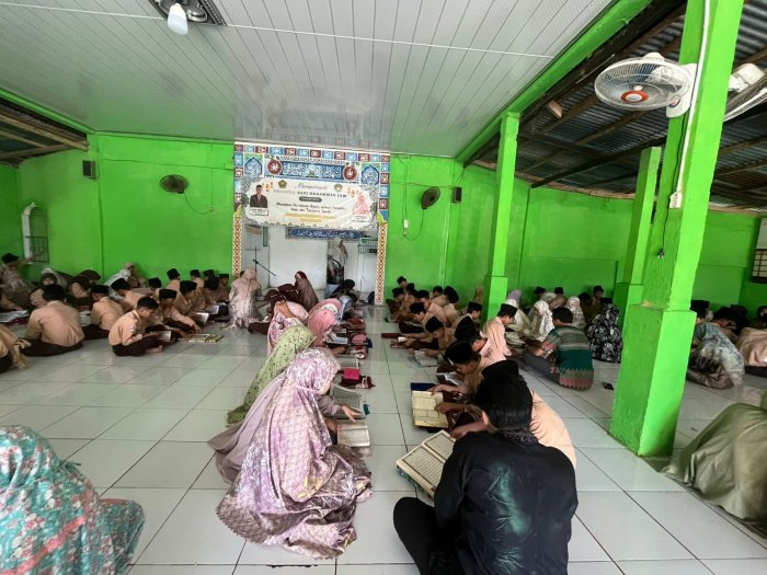 Suasana kegiatan berlangsung khidmat dan penuh kekeluargaan. Para siswa tampak antusias mengikuti kegiatan ini, membaca Al-Qur’an dengan tertib di ruang yang telah disediakan oleh madrasah.