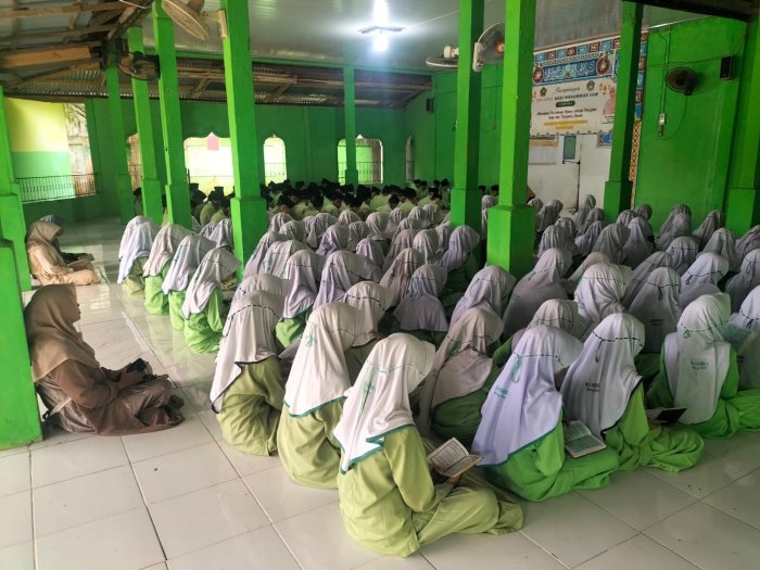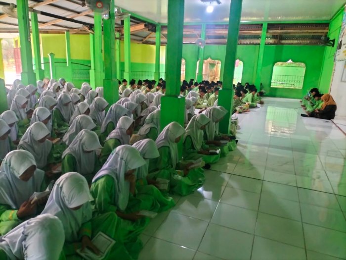 Bertempat di mushalla madrasah, kegiatan diikuti oleh seluruh siswa, guru, serta tenaga kependidikan dengan penuh khidmat. Para siswa tampak duduk rapi, membaca surat Yasin dan melantunkan tahlil secara bersama-sama, menciptakan suasana religius yang menenangkan.