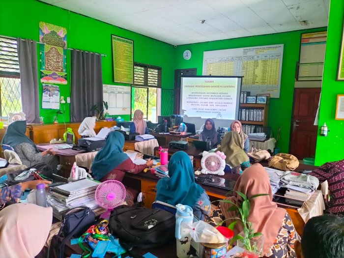 Batang Hari — Majelis guru dan tenaga kependidikan MTsN 5 Batang Hari menunjukkan antusiasme tinggi dalam mengikuti kegiatan sosialisasi pencegahan dini penyakit kanker dan tumor yang digelar bekerja sama dengan Yayasan Pencegahan Kanker Nusantara Provinsi Jambi. Rabu (15/4/26)